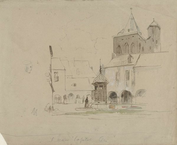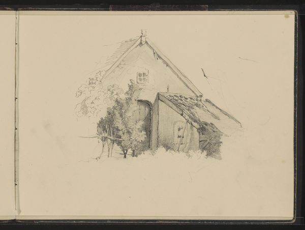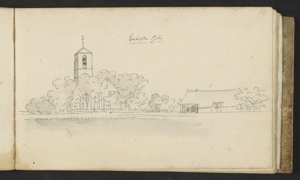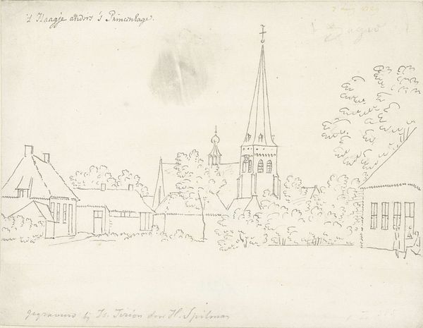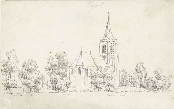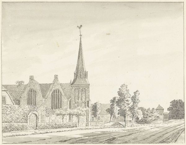 Editor: This drawing, "Kerk met twee torens" or "Church with Two Towers," is a pencil drawing on paper by Maria Vos, likely created between 1834 and 1906. There’s something very serene about this quiet landscape. What strikes you most about this sketch? Curator: I am intrigued by the symbolism inherent in the church and its visual placement. Notice how the twin towers dominate the scene, aspiring upwards, yet are rendered in soft pencil, lacking sharp definition. Does this suggest to you a fading memory of faith, perhaps, or a gentler, more contemplative spirituality? Editor: That’s interesting. I was focusing on the realism in the landscape, but the fading memory aspect is something else. It makes me think about the passage of time and how the significance of religious institutions might evolve. Curator: Exactly! Think about how churches, throughout history, have served as beacons of hope and authority, their architectural details loaded with symbolic meaning. What do the gothic windows whisper? What message is conveyed by the cross at its highest point? Editor: The gothic windows remind me of striving towards heaven. And I suppose the cross, no matter how simply rendered here, remains an assertion of belief. Curator: Indeed. Consider too, the surrounding nature, also softened by the artist’s hand. Nature’s permanence contrasted with the architecture, implying something about mankind’s place in this world, our ambition versus humility. Does Vos seem celebratory or melancholic here? Editor: I initially saw serenity, but I think melancholic may be closer. This has really highlighted the subtle but powerful symbols present, moving it beyond just a simple landscape drawing. Curator: Absolutely. Visual elements woven together create layers of narrative about faith, time, and human experience. Editor: I’ll definitely look at landscapes differently from now on! Thanks for sharing your insights.