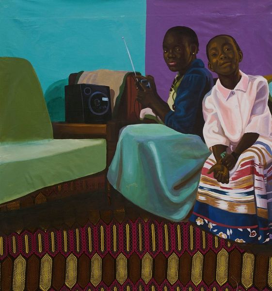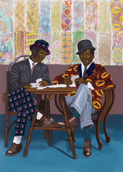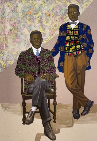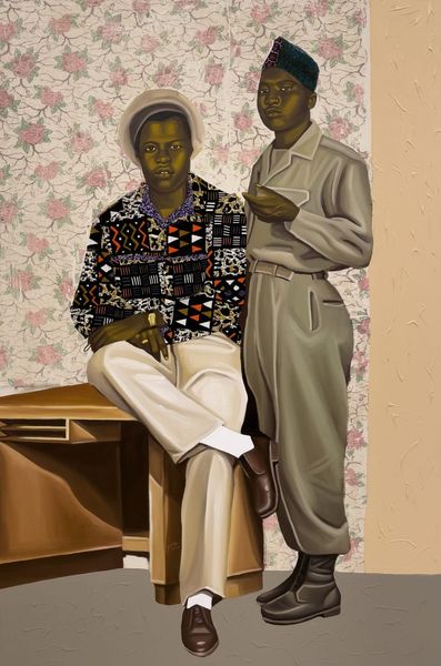 Editor: We are looking at "Anuanom" by Cornelius Annor, created in 2020 using oil paint. I’m struck by the textures and the contrast between the flatness of the background and the detailed clothing of the figures. What strikes you most about the composition? Curator: Initially, my focus is drawn to the compositional arrangement: two figures positioned symmetrically around a central table. Consider the geometric patterning--the interplay of the checkerboard floor and the distinct fabrics. Do you notice how the patterns, although varied, create a unified visual field? Editor: I do. There’s a lot of detail, but it doesn't feel chaotic. Is that related to the restricted color palette? Curator: Precisely. The earthy tones and the subtle shifts in value allow for a cohesive reading. Also, examine the surface quality—the smooth, almost glazed effect contrasts with the implied texture of the textiles. This interplay activates the picture plane, encouraging closer observation. Note the way the formal constraints allow for an expression of, say, modern Black identity. Editor: So it’s almost like the restriction of colors makes us look more closely at the geometry and textures. The outfits stand out. Curator: Precisely. It is a dialogue between surface and structure, pattern and plane, ultimately creating an interplay between representation and abstraction. I think it also pushes genre-painting. It's pushing some other conversations out too, but perhaps later. Editor: It's amazing how much is communicated through the arrangement of shapes and colors. It sounds like you are implying that a certain reading and the artist's intended meaning may not completely align, or am I incorrect? Curator: In some instances that occurs, yes. As with all formalism, close viewing creates an opening to larger fields. Editor: It gives me so much to think about in terms of how artists choose to communicate meaning beyond the representational.