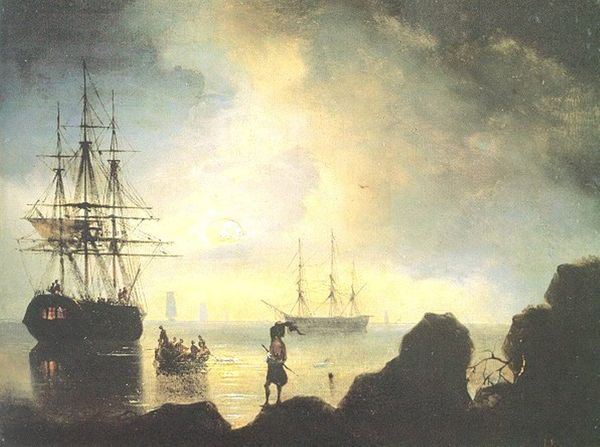 William Bradford created this painting, 'The Schooner 'Jane' of Bath, Maine', with oil on canvas. At first glance, the scene is dominated by the warm, luminous expanse of the sky, where yellows and oranges blend seamlessly. The horizon is punctuated by ships, their silhouettes offering a stark contrast to the ethereal glow. Bradford masterfully uses atmospheric perspective, creating depth and distance. The schooner in the foreground is rendered with sharp detail, whereas the vessels in the distance are softened. This technique not only enhances the sense of space but also invites us to consider the artwork's structure. The arrangement of the ships across the horizontal plane creates a balanced composition. Each vessel, with its distinct rigging and sails, contributes to a visual rhythm. The interplay between light and shadow destabilizes any fixed understanding of maritime painting. It pushes beyond mere representation to evoke a sense of the sublime. Ultimately, the painting is a space where the factual meets the transcendental, inviting endless re-interpretation.