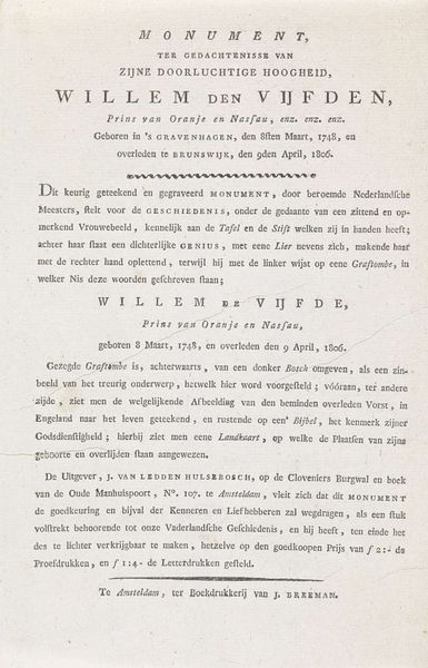 Editor: This print, created by J. Breeman in 1806, is entitled "Verklaring van de prent met het allegorische grafmonument voor prins Willem V," an engraved textile or paper memorial of sorts. It’s so text heavy; it's almost like an official decree or something similar. What stands out to you? Curator: For me, the layering of production is what’s most compelling. We see typography, textile elements suggested in the ornament, and graphic art combined. It blurs the lines between what we traditionally consider fine art versus printed matter created in workshops for broader distribution. Consider the division of labor involved. Editor: Ah, I see what you mean. How does that affect the reading of this memorial to Willem V? Curator: Well, think about the materials used. Paper, ink, engraving tools – these all point to a process of reproduction and dissemination. The cost is noted, indicating a market for commemorative items, turning grief into commodity. Where does genuine sentiment end and economic enterprise begin? What were the workshops where such items were produced like? What of the publishers who commodified grief for profit? Editor: So, it's less about the artistic genius of a single artist and more about a complex system of production and consumption. Curator: Precisely. And consider how that system shapes collective memory and reinforces societal hierarchies. Who was memorialized and in what form becomes less about the individual and more about who can afford commemoration. The materials themselves are doing a great deal of cultural work here. Editor: I hadn't considered the economics and social implications so deeply. Thanks! Curator: And thank you. Thinking about these aspects breathes new life into such works!