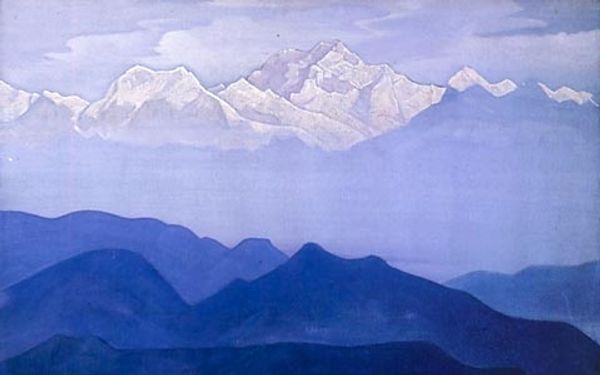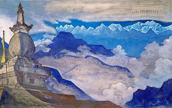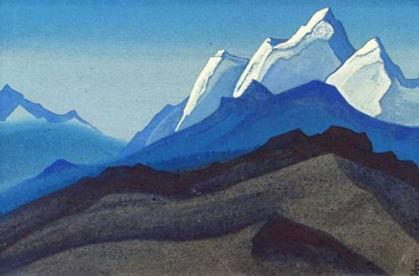 Curator: "Study to "Book of Wisdom,"' created in 1929 by Nicholas Roerich, utilizes tempera and watercolor on what appears to be board or a heavier weight paper. I am struck by the solitary figure and how dwarfed it seems by the immensity of the landscape. What do you make of it? Editor: I’m immediately drawn to the layers of the mountains, receding into the distance. It feels almost like a stage set, each layer a different plane. What I find particularly interesting is how Roerich combines watercolor with tempera; what does that combination of materials mean to you? Curator: It suggests a fascinating intersection of intentions and limitations. Tempera, historically associated with icon painting, speaks to a kind of timelessness, while watercolor, being more fluid and immediate, grounds it in the physical experience of painting. Roerich’s choice isn't arbitrary. Consider how those mineral pigments are acquired and processed; the labour involved. The sourcing itself likely embedded the painting in colonial dynamics related to artistic influence, extraction and market values. Does this impact how you view the scene? Editor: I hadn’t considered that. It's like the sublime landscape is built upon layers of materials, labor, and cultural exchange. It changes my perspective and I now feel unsettled when looking at it, especially thinking about the colonial undertones of those acquired materials. It speaks to a larger system of production and consumption. Curator: Precisely! It raises critical questions about our relationship with the landscape – not just as viewers but as active participants in systems that shape our perception of it. So even this "intimate" scene has broad material and colonial ties to consumption. Editor: I'll definitely keep the sourcing and the processing of art materials in mind moving forward. I never thought to see such things in landscapes. Curator: It’s a constant unearthing. We are always participating.