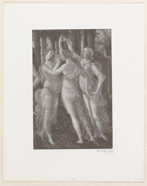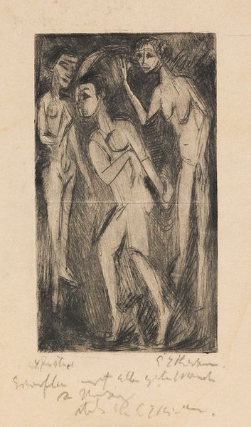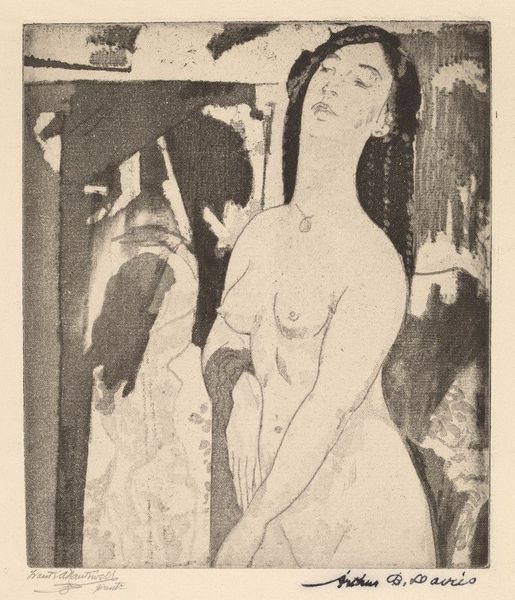 Editor: Arthur Bowen Davies' etching, "Ecstasy," created in 1916, presents three female figures in varying states of undress and what seems like expressive movement. It gives me a sense of hidden freedoms, or perhaps repressed desires bubbling to the surface. How do you interpret this work within its historical context? Curator: Considering the moment of its creation, on the cusp of the modern era, and just before the US entered WWI, I see Davies' "Ecstasy" as speaking to a broader cultural yearning for liberation and emotional intensity. These nude figures, rendered with an almost dreamlike ethereality thanks to the etching medium, recall classical ideals, but they're disrupted. Editor: Disrupted how? Curator: The symbolism is intentionally vague. There's a move away from strict, academic nudes. Davies, as a figure tied to the 1913 Armory Show, contributed to shifting art away from moralistic conventions towards subjective experiences and primal emotions. The figures exist in this strange in-between space: they are idealized nudes but somehow still possess an air of earthly sensuality that departs from academic tradition. Where do you see that tension reflected in its composition? Editor: I think it is apparent in their placement within the shadowy space - it’s like they’re trying to escape, and are being swallowed up all at once. The figures look stuck. The composition could indicate the repression of women. Curator: An insightful connection. Works like these were both pushing boundaries while simultaneously reflecting the continued struggle for self-expression against socio-cultural constraints. It is also hard to ignore that fact that while pushing these boundaries he was not representing reality and continuing the societal construct. Food for thought. Editor: Definitely given me something to ponder regarding how liberation, art, and constraints work together.