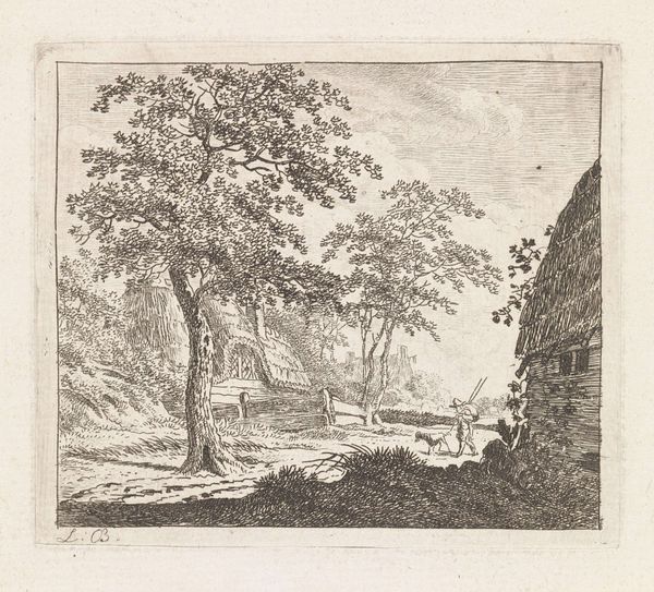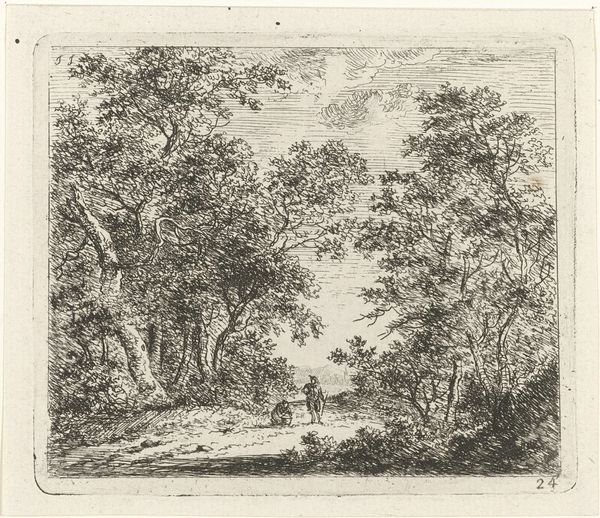 Editor: This is "Bebost eiland," or "Wooded Island," by Anthonie Waterloo, made sometime between 1630 and 1663. It's a Dutch Golden Age landscape created with etching and ink. I find it very detailed for such a small work. What do you see in this piece, particularly within the context of its time? Curator: Beyond its undeniable aesthetic appeal, this etching provides insight into the relationship between humans and nature during the Dutch Golden Age. What looks like a simple landscape actually reflects broader issues of land ownership, resource management, and even burgeoning national identity. Look at the way the land is depicted - seemingly untouched, yet subtly suggesting human interaction and a burgeoning capitalist perspective where everything, even nature, is a resource. How does that tension strike you? Editor: I hadn't considered the capitalist perspective. It's interesting, because at first glance, it seems like a celebration of nature’s beauty, almost romantic. Curator: Exactly! The romanticism is partly constructed. During this period, the Dutch were actively reshaping their environment through land reclamation and trade. An artwork like this normalizes and even glorifies that dynamic. The Church spire in the background speaks to the complex power structures operating in rural life at the time. Editor: So, it's more than just a pretty picture; it's a visual document reflecting socio-economic shifts and power dynamics. It makes me wonder, to what extent do these idyllic landscapes mask the realities of the time? Curator: Precisely. That questioning is critical. Art doesn't exist in a vacuum, but it is embedded within broader social and historical conditions, so by reading between the lines we can unravel narratives that were perhaps intentionally concealed. Editor: That's a really insightful way to look at landscape art; it's completely changed my perspective. Curator: And for me, your fresh eyes remind me how relevant these historical readings are today, as we continue to grapple with similar themes of resource use and environmental responsibility.