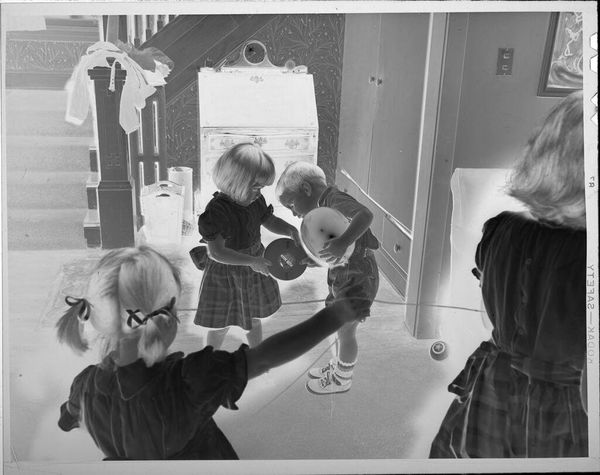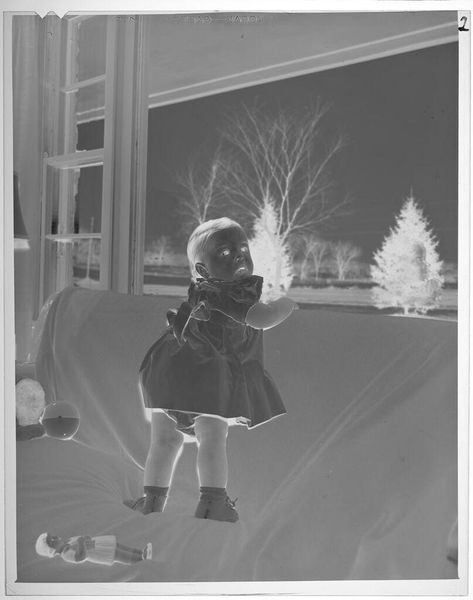 Editor: This photograph by Lucian and Mary Brown, titled "Untitled (woman holding baby, looking into mirror)," immediately strikes me as intimate, yet somewhat unsettling with its negative exposure. What do you see in this piece? Curator: The mirror motif is fascinating here. It's not just reflecting an image but fracturing identities. The mother's gaze is direct, while the child is both present and doubled. Is she showing the child themselves, or the potential they could see in themselves? Editor: That's intriguing, the idea of potential. It almost feels like she is showing the child who they are to others. Curator: Exactly! Mirrors often symbolize self-awareness, truth, illusion. The photographic negative further complicates that symbolism, making us question what is real and what is a reflection. The child's future in a reversed world? Editor: It gives the photograph a very mysterious depth. I never would have thought about it that way. Curator: And that interplay between the known and unknown is what makes it a strong piece, wouldn't you agree?