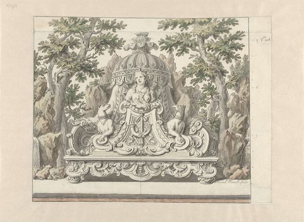 Editor: Here we have “Designs for Two Garden Ornaments” by Daniël Marot, dating roughly from 1705 to 1769, an ink drawing on paper. It feels incredibly formal to me, but also kind of whimsical with the measurements noted directly on the sketch. How do you interpret this work? Curator: Well, considering Marot's role as a key designer for William and Mary, these aren't mere whimsical doodles. They're visualizations of power and control projected onto the landscape. We see Neoclassical elements, referencing antiquity, but shaped for a very specific political purpose. Notice the statues – idealized figures meant to embody specific virtues or perhaps allude to rulers. Editor: So, the gardens aren't just pretty, they’re saying something? Curator: Precisely! The geometric forms and carefully positioned statues would have been immediately legible to the educated elite, communicating order, reason, and, of course, the patron’s cultivated taste and authority. Who do you imagine would experience the impact of this designed space? Editor: Obviously, those with access. I guess it's easy to forget that even something as seemingly innocent as garden design can reinforce social hierarchies. Curator: Exactly. And this drawing lets us glimpse the planning stages of that reinforcement. It shows how design contributes to creating not only physical spaces but social and political ones as well. Editor: That’s a really interesting point. I’ll never look at a garden the same way again! Curator: Indeed. It highlights how art and design function within broader historical and social structures. Now, next time you wander in the park, consider whose vision it reflects and what that vision sought to communicate.