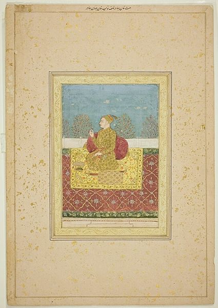 This Mughal painting, "The Emperor Shah Jahan with his Son Dara Shikoh" was crafted with opaque watercolor, ink, and gold on paper. The composition immediately draws the eye to the figures of Shah Jahan and his son, framed against a flat, pale green backdrop that creates a sense of serene distance. Notice how Nanha uses precise lines and a subdued palette to define the forms, emphasizing the textures of the fabrics and the details of the floral border. This border, rich with natural motifs, contrasts with the minimalist space occupied by the emperor, introducing a tension between the personal and the ornamental. The artwork's arrangement suggests a hierarchy, with the emperor elevated on a platform, subtly reinforcing his status. However, this is juxtaposed with the intimate familial scene, complicating our understanding of power and personal relationships. The semiotic interplay of symbols like the peacock—associated with royalty—within a naturalistic setting reflects a deliberate construction of meaning. This invites us to contemplate the layers of representation within the Mughal court's artistic and philosophical context.
