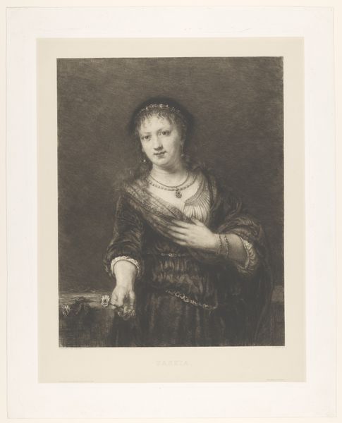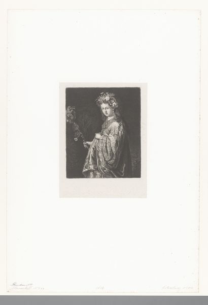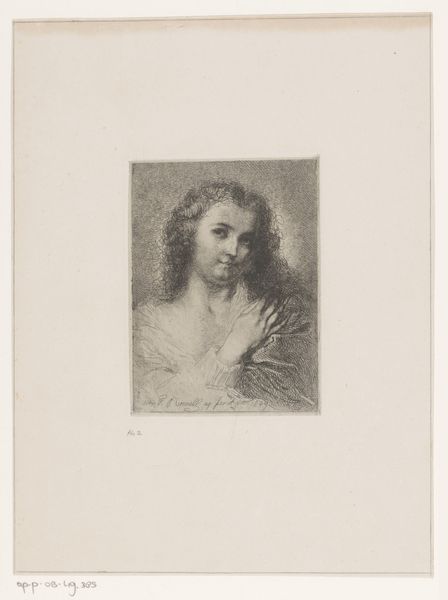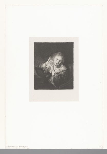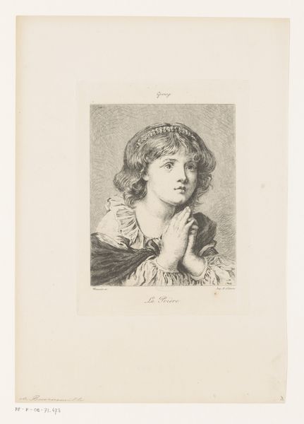 Curator: This engraving, titled "Allegori over håbet," or "Allegory of Hope," from sometime between 1828 and 1899, presents us with a compelling image. Editor: It's immediately striking—the stark contrast and the upward gaze create an intense sense of longing. The tonal range achieved in this print is really quite remarkable. Curator: Indeed. The choice to depict hope allegorically was a popular one, steeped in tradition, especially when one considers the sociopolitical climate of Europe at the time. These allegorical figures often served as beacons of perseverance. The artist offered an image, not of concrete change, but the enduring spirit needed to pursue it. Editor: You can see the attention given to line work and texture, especially in rendering the drapery and hair. Note how those textures almost seem to vibrate against the plain background. The artist expertly used hatching and cross-hatching to construct form and simulate a captivating, tangible reality within the print. Curator: The woman's posture, hands clasped in prayer or supplication, makes an interesting point. While the artwork might have been created with good intention, we should be sensitive to those who are not Christian when considering the visual language of this era, which may not have been intended for secular audiences. Editor: A very valid point. I can't help but return to that play of light and shadow, however. It is the composition of light with its absence that really helps convey the mood here. There’s an interesting dialogue between formal composition and subject matter in this work. Curator: It is a dance between visibility and invisibility that truly captured audiences in the romantic era! Thank you for guiding us through the engraving. Editor: The pleasure was all mine; looking again I note there are worlds of feeling conjured with only simple lines.