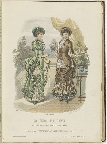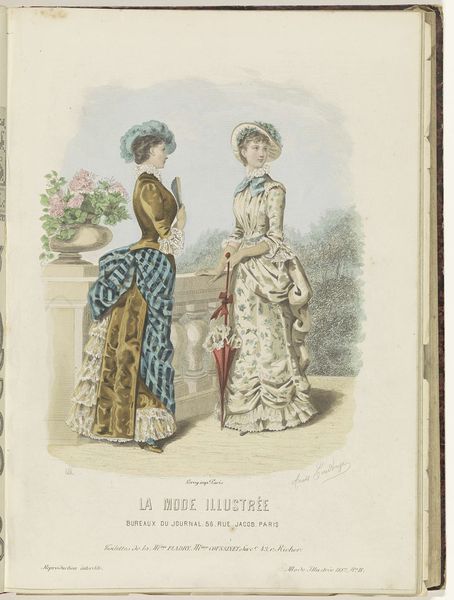 Editor: This is a page from *La Mode Illustrée, Journal de la Famille* from 1882. The print showcases two women in elaborate dresses. There's a quiet intimacy to the scene that’s quite striking. What catches your eye when you look at it? Curator: I see an intentional encoding of status and femininity. Look at how the women are positioned. The woman on the right, near the jewelry box, presents herself with a careful consideration to beauty. Whereas the woman in blue gestures towards her companion as though passing along wisdom, creating a dynamic of mentorship. Editor: Mentorship? I hadn't considered that. I was more focused on how the clothing really defines the figures. What do the colors suggest to you? Curator: The soft blues and pinks beside the darker red create a symbolic dichotomy of innocence versus maturity. Think about how these colors would be perceived at the time. How is femininity being constructed and conveyed through visual language here? The mirror implies the ephemeral nature of beauty. Editor: So it's not just fashion, it’s also conveying something deeper? Curator: Exactly. Consider the cultural significance of the family journal at the time, it became a locus through which social norms were promulgated. Visual elements within this print establish not just the style of the time, but a script on how to conduct oneself within these roles. Editor: That's fascinating! I guess I was just seeing pretty dresses. Now, I am considering the way meaning can be embedded in what appears at first glance. Curator: And it is precisely through this encoding of status that we glimpse the hopes, aspirations, and constraints that structured the daily experiences of those who once leafed through these very pages.