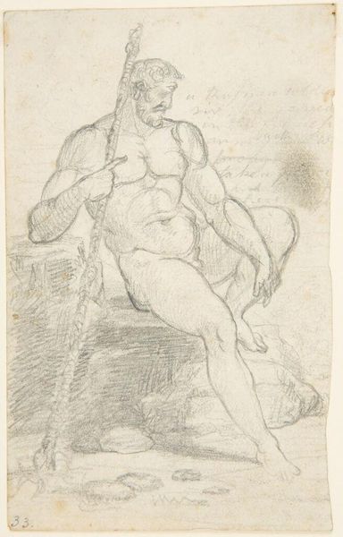 This is Michelangelo's "Male Nude," a sketch in graphite on paper. The drawing presents a nude male figure, rendered with precise anatomical detail through delicate lines and shading. The composition emphasizes the body's form and musculature, typical of Michelangelo's interest in the idealized human figure. The figure's pose, with its weight shifted and head bowed, creates a dynamic tension within the static medium of drawing. This tension is further enhanced by the contrast between the finely detailed torso and the more loosely sketched extremities. Michelangelo masterfully uses line to define the contours and volumes of the body, exploring the interplay between light and shadow. The drawing exemplifies a focus on the human form, which was a hallmark of Renaissance art and a reflection of broader philosophical inquiries into humanism and the natural world. Consider how the formal arrangement of lines and the figure’s posture engage with classical ideals of beauty and the intellectual pursuit of understanding human anatomy, ideas that continue to evolve through ongoing interpretation.