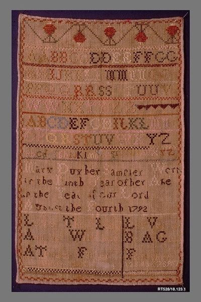 Curator: What catches my eye is how incredibly fragile and intimate this sampler seems, almost whispering stories of a life carefully stitched onto fabric. Editor: Indeed. What we have here is an embroidered sampler, dating back to 1802. The piece, currently housed in the Metropolitan Museum of Art, was created by a Cynthia Alden. As a mixed media artwork, combining drawing and textile elements, it presents a fascinating glimpse into early American decorative arts. Curator: I'm immediately drawn to the verse, its plea for humility and the mention of learning. In that context, how can we consider samplers not merely as displays of needlework skill, but also as vital texts documenting women’s education, labor, and religious belief systems of the era? Editor: Exactly. Samplers served as concrete manifestations of a young girl’s education within the domestic sphere, providing crucial training for household management and nurturing essential moral virtues through selected texts. Also note “Claremont, May 26” is stitched in the bottom-right corner of this piece. Perhaps Claremont, New Hampshire, or possibly a relative in that area? The historical records might give us context into Cynthia's socio-economic and religious circles. Curator: You're right. And I find it compelling how these skills intersect with notions of virtue and domesticity, essentially policing women’s roles in society under the guise of pious expression. Editor: To counterpoint, although constraints certainly existed, doesn’t art like this also illustrate creative agency? These samplers represent expressions of individuality within permissible frameworks—subtle acts of rebellion against pure utility and constraints, if you like. Curator: Hmm… food for thought. Cynthia Alden's creation prompts vital conversations about American girlhood, piety, labor, and the subversive potential that lies hidden within prescribed creative outlets. Editor: Well said. By examining it within broader educational and cultural practices, we can learn a great deal.