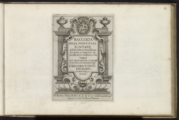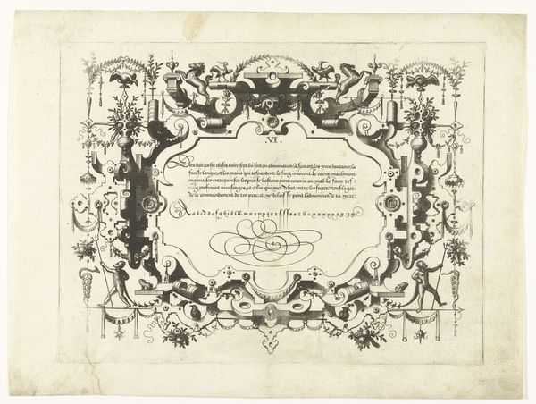 Curator: This intriguing print, currently held in the Rijksmuseum's collection, dates back to around 1600. Its full title is "Titel in ornamentele lijst met aan beide zijkanten een vat met een kikker en vogel op de rand," made using engraving techniques, with both ink and colour details added to paper. What strikes you most when you look at it? Editor: The first thing that grabs my attention is the feeling of contained exuberance. It’s ornate, almost overflowing, but framed within very rigid, geometric borders. The image makes me think about how artists navigate constraints. Curator: Precisely! The piece acts as a title page or frontispiece, presenting itself formally but offering an abundance of Renaissance symbolic devices. Consider, for example, the vases flanking the text, each adorned with a frog and bird—ancient symbols linked to transformation and the soul's journey. We find here visual mnemonics connected to ideas and cultural narratives of its time. Editor: And aren't those grotesques cascading down from above those vases? The combination of classical urns and the somewhat bizarre ornamentation makes me wonder about its broader social function. Who was this intended for and how would it be displayed, used, and disseminated? Curator: It served as an advertisement for Hans Vredeman de Vries’s designs, who conceived “various fountains” alongside aerial views and embellishments. As indicated by the printed German at the bottom, this engraving made public these fountains which were 'never printed' before—serving to establish Vredeman de Vries in his era and solidify his role to the modern day. Editor: It’s interesting to consider how these types of printed images played a key role in establishing the careers of individual architects or designers during the early modern period. Printed matter functioned as promotion. The image contains marketing intertwined into the visual design and layout itself. Curator: Indeed! It presents a beautiful intersection of commerce and craft, of immediate visual appeal, of symbols ancient and brand recognition. It's all interwoven. Editor: Looking closer helps to peel away how art operates not just within aesthetic confines, but within institutional structures. Fascinating.