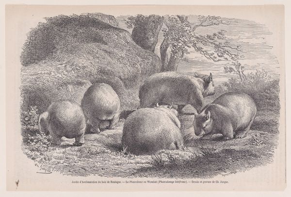 This print, "Wild Boar Attacked by Dogs", was made by Victor Adam in the 19th century, using lithography. Lithography is a fascinating process. The artist draws on a flat stone with a greasy crayon, then the stone is treated so that ink only sticks to the drawn areas. This allows for detailed, reproducible images. Looking closely, you can see how Adam used this technique to create a dynamic scene. The dense, dark lines bring out the boar's bristly fur and muscular form, contrasting with the smoother, lighter tones of the dogs. Lithography allowed Adam to capture a sense of movement and tension, freezing a moment of wild struggle on a stone surface. Prints like these were not just art; they were a form of mass communication. Sold at relatively low prices, they brought images of nature and hunting scenes into middle-class homes. This print speaks to the rise of industrial production in art, making images accessible while also shaping perceptions of nature and leisure in a rapidly changing society.