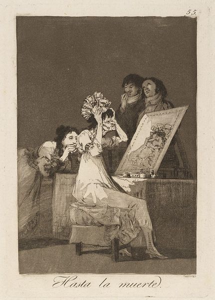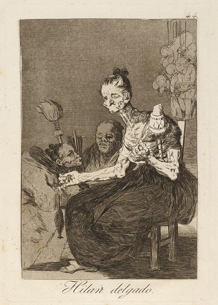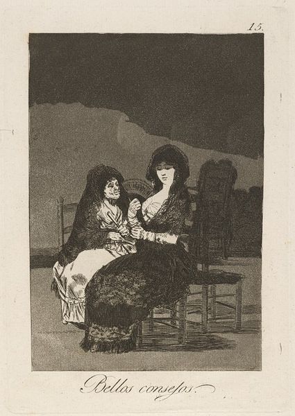 This etching, by Francisco Goya, presents a scene laden with the symbols of vulnerability and societal critique. We observe a young woman, her exposed leg suggesting a moment of intimate grooming or perhaps medical inspection, while an old woman, possibly a procuress, mutters prayers, her rosary beads a stark contrast to the scene's underlying reality. The act of prayer, seemingly pious, takes on a sinister hue. The rosary, traditionally a symbol of devotion, here becomes an emblem of hypocrisy, a veil for darker deeds. This juxtaposition reminds us of similar motifs found in medieval morality plays, where religious symbols often masked earthly corruption. Such imagery taps into a collective memory, a cultural understanding of the discrepancy between outward appearance and inner truth. Goya masterfully engages our subconscious, challenging our assumptions and provoking a visceral response to the exploitation veiled in religious guise. This symbol resurfaces, a potent reminder of how easily faith can be manipulated, its cyclical return echoing through history's corridors.