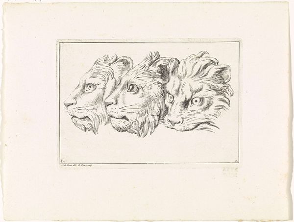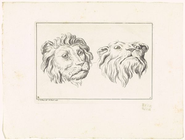 Editor: Here we have "Two Lion Heads, in Profile," a drawing in ink by Bernard Picart from 1729. They appear to be roaring or perhaps yawning? What strikes me most is how one lion is slightly in front of the other; I am keen to know what you observe in this Baroque artwork. Curator: From a formalist perspective, this drawing presents an interesting study in contrasts and visual rhythm. The composition directs our eyes between the two lion heads, each meticulously rendered. Notice the lines that define their manes – energetic and free-flowing versus more controlled, shorter lines; a study of contrasts. What does this variance communicate? Editor: I hadn't considered the texture! Is the difference perhaps intending to express age or power dynamics through these styles? Curator: Perhaps. Note the deployment of the line, too. Consider how the hatching technique contributes to the overall sense of volume and form. Also, reflect on the tonal variations Picart creates simply by varying the density and direction of his lines, and note the visual impact of those two nearly identically opened mouths. What significance could we draw from that duplication of form? Editor: This artwork provides such intriguing insight into the relationship between representation and line; your insights help me to appreciate Picart’s capacity for creating a sense of liveliness and power through careful and repetitive mark-making. Curator: Indeed. This piece serves as an exemplary lesson in seeing and understanding through structural design; observing the intricate formal relationships provides meaning, independent of subject.