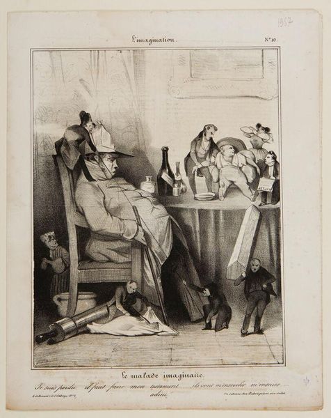 Curator: Here we have Honoré Daumier's "Le Depute Ventrigoulu," held in the Harvard Art Museums collection. Editor: He looks utterly beleaguered. Overwhelmed, even. Curator: Daumier, known for his satirical lithographs, often targeted the French bourgeoisie and political figures. This piece reflects the disillusionment with those in power. Editor: The chaotic energy of the miniature figures surrounding him emphasizes his weariness. It's as if they're literally draining his energy. Curator: Indeed. The title itself is a play on words, poking fun at the deputy's physical appearance, suggesting greed and self-importance. Editor: It's a powerful statement on accountability and the burden of political office, one that resonates even today. Curator: Absolutely. Daumier's work serves as a reminder of the artist's role in holding power to account. Editor: And of how relevant satire remains.