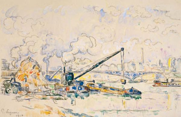 Curator: Stephen Bone's large canvas, Stockholm in Winter, captures a bustling scene, a frozen port city rendered in cool tones. Editor: My first thought is about how serene it looks despite all the activity. There's a certain stillness to the light, almost like time is suspended. Curator: Absolutely. Bone, who lived from 1904 to 1958, uses the white of the snow to unify the composition, linking the foreground activity with the distant cityscape. The ships, the cranes, even the figures, all contribute to a sense of industry and connection. Editor: Right. And the repeated motif of the flag feels significant. It's a symbol of place and identity, anchoring the scene. The smoke rising from the ships adds another layer. Perhaps alluding to constant movement and transit. Curator: Bone captures that very well. It's a quiet, introspective kind of energy. Editor: The way he simplifies the forms gives the painting a timeless quality. It could be any winter, any port city. Curator: So true, it's a perfect example of finding peace even in chaos. Editor: Yes, it makes you think about how humans continuously interact with nature.
