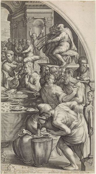 Curator: Looking at this canvas by Palma il Giovane, created around 1600, you immediately get a sense of theatricality. The scene appears dramatically lit, almost stage-like. Editor: It strikes me as a morality play unfolding right before our eyes. I can almost feel the intoxicating pull of earthly pleasures emanating from the canvas. Curator: Absolutely. The painting is titled "Amusements of the Prodigal Son", a story popularized by the Bible. Consider how it might reflect anxieties in Venice during the artist's life? After the Council of Trent, art began to express the morals. This Baroque style, it’s also clearly trying to get to one's emotions, wouldn't you agree? Editor: Indeed. And il Giovane really lays it on thick, doesn’t he? Every object tells a story, or maybe, is more about wealth than an intended biblical parable. Consider the way Palma il Giovane frames the son with the wine bearer and the plates—very luxurious and expensive—that reinforces not just his lavish, yet ultimately fleeting lifestyle, but one about social currency and power, too. Curator: He clearly draws inspiration from earlier Venetian masters like Veronese, but introduces a distinct intensity. There are art critics who might compare him with Caravaggio... I can feel your disapproval brewing, and understand how the treatment of subject contrasts might strike an Iconographer as jarring. Editor: To me it represents, above all, vanity and temporality. The prodigal son's stupor almost suggests spiritual emptiness; or at least he is physically overwhelmed, as if it is an impending symbol for ruin. He becomes so immersed, he neglects his true values for superficial and hedonistic things. I interpret this work almost like a Memento Mori. Curator: Which leads to this being installed and held by Galleria dell'Accademia of Venice. It's hard to say if it had the exact effect il Giovane wished, considering its function in the present is mostly to signal an antiquated set of ideals from religious doctrines. Editor: Palma’s message is timeless. Its message still relevant and thought provoking regardless of any religious affiliation one may have or not.