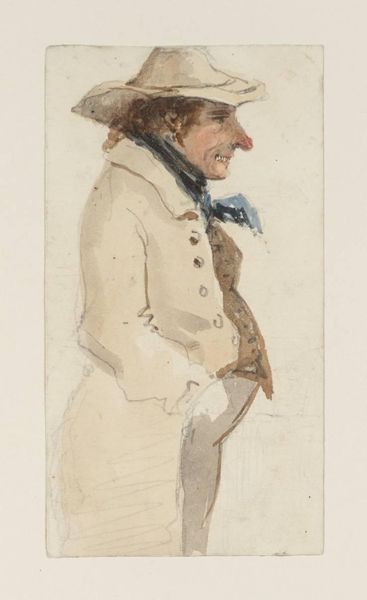 Curator: What a peculiar vantage point! Eeckhout's "Major von Gagern, seen from the back," rendered between 1803 and 1861. A pastel drawing, currently residing here at the Rijksmuseum. Editor: It does feel oddly voyeuristic, doesn't it? The formal rigidity of the military uniform juxtaposed with the softness of the pastel creates a strangely vulnerable depiction. I'm intrigued by the composition; the stark, mostly obscured back view immediately sets it apart from standard portraiture. Curator: The back view is unconventional, definitely. But perhaps it directs us to ponder the materials themselves, and the role of military production within the context of 19th-century society. The crafting of this uniform, the tailoring of power... How much did such outfits cost at the time, and who were making them? Eeckhout is depicting status through material display, making one want to unpack labor conditions in fashion and military. Editor: Absolutely. And I wonder about the semiotics of the turned back. Is it a gesture of dismissal? Or perhaps an invitation to contemplate the inner world of a man defined by external, societal structures? The textures are exquisite – the way the pastel suggests the weight of the epaulettes and the slight curve of the man's spine… The interplay between light and shadow is key. Curator: Indeed. And what of Gagern himself? His historical context. This image almost suggests it, but if we ignore context then this just turns into abstract beauty and lines. Instead, understanding von Gagern is pivotal. Editor: Fair enough. The man lived through the Napoleonic era, fought in several campaigns... perhaps the artist aimed to depict him as a figure facing away from the glories of war and more involved in society at the time. Curator: Right. Romanticism in art frequently involved examining heroes, sometimes debunking heroism. So the rear shot humanizes Von Gagern, in contrast with classic, heroic portraits that tend to over-inflate subjects. Editor: Well, whatever Eeckhout's intentions, the picture sparks questions. It feels so modern to me and invites continued dialogue! Curator: An interesting way to capture historical perspective – literally showing us the *back* end of an era as society slowly advances into modern eras.