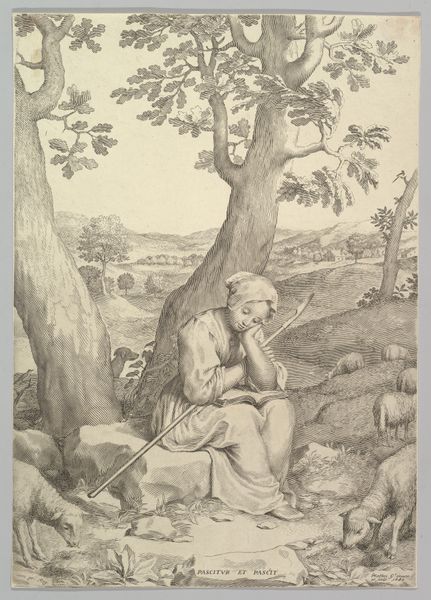 Curator: This etching, "St. Genevieve," was created by Claude Mellan sometime between 1600 and 1688. It now resides here at the Metropolitan Museum of Art. What's your initial take? Editor: My first impression is one of serene stillness. The delicate lines create a muted atmosphere, a dreamlike quality. The young woman seems lost in thought, nestled in a tranquil landscape. Curator: It's a deceptively simple image. Mellan’s depiction of St. Genevieve taps into deeply ingrained societal expectations of female piety and pastoral labor. Here, she embodies both, seemingly suspended between worlds as a shepherdess and a figure of devotion. Note how she rests her head on a book of Psalms while watching over her flock. Editor: Absolutely, the composition draws the eye to that central figure, framed by the trees, softened by the meticulously rendered light. The interplay between the figure and the landscape strikes me, the balance of dark and light emphasizing the gentle curves of her face and the textural contrast of foliage. What about the function of that crook and the surrounding sheep? Curator: The crook is an interesting detail; we know from interpretations of Mellan's other artworks that the objects accompanying a woman, such as her profession, indicate that she occupies a more active role than traditional accounts might concede. Similarly, by highlighting the flock, Mellan suggests that Genevieve protects Paris. We also have to consider how religion shaped female existence in 17th-century France. Genevieve embodies that tension—domestic caretaker but with inner resources that would help to develop self-expression and spiritual reflection. Editor: Your comments invite considerations about narrative conventions, while I see how Mellan's virtuoso line work creates this captivating stillness and emphasizes Genevieve’s presence. His skillful use of light and shadow shapes and gives volume to this idealized vision of piety. I'm still caught by how he transforms simple lines into form and substance. Curator: Yes, considering Mellan's historical context, that precise rendering becomes almost radical. "St. Genevieve" isn't just a religious scene; it quietly suggests a space for female agency within a highly structured society. Editor: In the end, regardless of its sociohistorical roots, I'm struck by its quiet beauty, the masterful balance of composition, form, and line. Curator: Precisely. Mellan prompts us to delve into this quiet space—a liminal area that balances societal expectations with introspective depths.