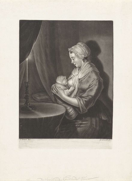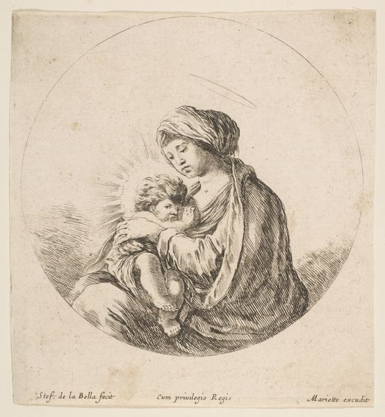 Curator: Let's turn our attention to Frederick Bloemaert’s engraving, "Madonna met Kind," which dates to around 1650-1700. It's currently housed in the Rijksmuseum. What are your first impressions? Editor: Immediately, I’m struck by the intimate, almost melancholic mood it evokes. The close hatching gives it a weighty, substantial feel despite being on paper. Curator: It's interesting that you pick up on that intimacy. During the Baroque period, depictions of the Madonna and Child often served not just as religious icons, but also as a reflection of contemporary social values and family structures. The mother and child bond was frequently emphasized. Editor: Agreed. And the visual vocabulary is fairly simple, which amplifies the composition. Bloemaert's manipulation of line and shadow defines form beautifully. The overall texture seems dense, concentrated primarily around the base. The figures emerge gently from a shallow, undefined space. Curator: We can contextualize Bloemaert's artistic choices. Think about the role of women in the 17th century. This engraving speaks to the centrality of motherhood but within societal constraints that significantly limited women’s autonomy. Bloemaert captures a moment of tenderness, but does he perhaps also unintentionally allude to those restrictions? Editor: Potentially. But I also see in the deliberate and varied marks of the engraver the expression of form: note the directional hatching, creating a deep sense of shadowed mass, volume, and drama. Curator: Viewing this through the lens of art history and cultural studies provides richer insights beyond formal considerations, showing us what this engraving might be conveying about historical power dynamics within the family, within the church, within society. Editor: A perspective I find compelling. I suppose our interpretations highlight the complex intersections inherent in this work.