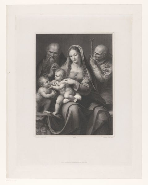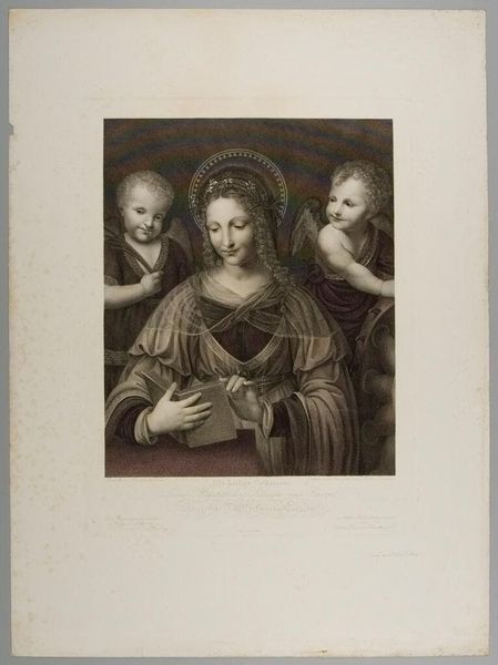 Editor: This is "Madonna with Two Angels," an engraving by Johann Gotthard Müller from 1804. It's really striking how serene it is, almost ethereal, with those soft lines. How do you interpret this work purely from a visual perspective? Curator: Let's observe the formal arrangement. Notice the pyramidal composition, a classical structure providing stability and balance. The chiaroscuro, the interplay of light and dark, models the figures, giving them volume and a soft, almost sculptural presence. How do the tonal gradations affect your perception of depth within the picture plane? Editor: I see that. The darker background makes the Madonna and angels stand out. The soft modeling gives them this beautiful, rounded quality, even though it's just an engraving. It is the structure reminiscent of the Italian Renaissance? Curator: Precisely. This Neoclassical work borrows heavily from earlier models. Consider the use of line: meticulously rendered, controlled, emphasizing contours and form. Does this linear precision serve to elevate the subject, imbuing it with a sense of idealized beauty? It almost transforms a sacred moment into a design piece. Editor: It really does, it’s very calculated. The halos and the Madonna herself seem to create a sense of perfected humanity. Curator: Agreed. The very texture that comes from the engraving technique itself is something that should be noted. Editor: This piece highlights the artist's impressive ability to work with tonal variations to produce dimension. It's been enlightening to examine the formal strategies.