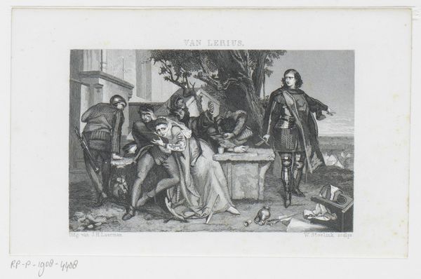 Curator: This etching, "Diogenes in His Tub with Alexander and His Generals" created by Carl Russ in 1810, presents a fascinating juxtaposition of power and philosophy. I’m curious about your initial take on this piece. Editor: Immediately, I’m struck by the contrast. The central figures are rendered with incredible detail while the surrounding landscape almost fades into the background. There is this powerful sense of immediacy, it’s really well crafted. Curator: The historical context is quite rich here. Diogenes, the Cynic philosopher, famously lived in a tub, rejecting societal norms. Alexander the Great, on the other hand, was the ruler of an empire, embodying worldly power. Editor: Exactly, and that’s where the critical reading starts. Is this rendering a valorization of poverty or critique of excess, especially when situated historically? The dynamic raises so many questions about systems of belief and challenges that underpin the socio-political structures of the period. Curator: Art historically, this etching reflects the neoclassical style prevalent at the time, characterized by its emphasis on line, form, and classical subjects. The scene depicted draws from ancient anecdotes, blending historical fact with moral lessons. This was the way narrative paintings communicated in that era. Editor: But is the work truly successful in challenging norms when produced during an era of rising national sentiment? Could the glorification of the past not subtly serve existing power structures, using a historic example of rebellion as a symbol within a specific society? It is fascinating to consider what and whom these artistic choices were supposed to serve. Curator: It raises a critical question. Even within its apparent advocacy for simple living, the artist might inadvertently be perpetuating power dynamics by merely staging this encounter, effectively containing it within a controlled artistic frame. Editor: Indeed. Art rarely exists outside of power; its mere representation always risks upholding specific social hierarchies. We must analyze the visual message alongside the backdrop of 19th-century European political developments. Curator: These nuances really highlight how artworks operate not only as aesthetic creations, but also as intricate reflections of their time. Editor: Agreed; engaging with them demands that we also evaluate the cultural contexts and biases woven into their making. Thanks for shedding light on this work.