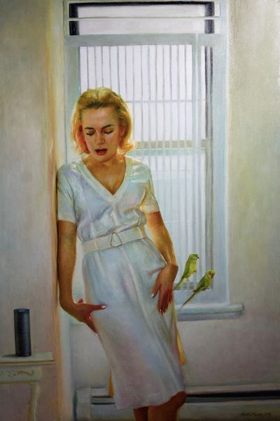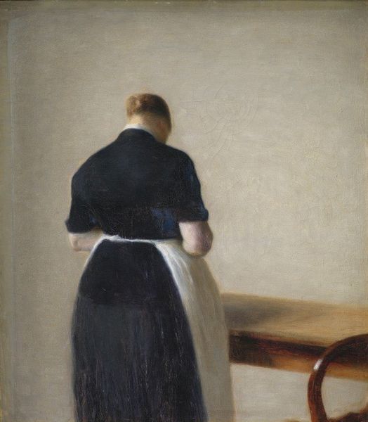 Bo Bartlett painted this intriguing work, "Commonwealth," sometime after 1955 with oil on linen. It's dominated by a muted palette, primarily greys and yellows, which creates a somber, reflective atmosphere. The composition centres on a lone woman standing before a large, basin-like sink, her back turned, inviting us to contemplate her isolated world. The structural elements are starkly simple: vertical lines of the door frame and the figure contrast with the horizontal emphasis of the sink. The light, predominantly on the sink and the woman's back, pulls our attention to the centre, while the darkness surrounding them hints at a confined space, both physically and perhaps emotionally. Bartlett uses realism not just to depict but to dissect. The woman’s averted gaze is a structural device, a sign that could signify introspection, alienation, or perhaps a quiet rebellion against the viewer's gaze. This interplay between form and content challenges our easy assumptions, urging us to reflect on the complexities of identity and the self.