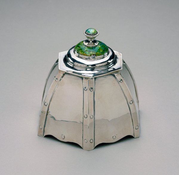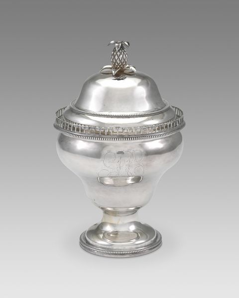 Curator: Here we have an exquisite tobacco jar dating from after 1791. It's silver, adorned with pearl-edged embellishments, and sits upon a wooden base. Editor: Oh, how utterly precious! It makes me want to handle it and feel its weight and smooth, cool surface. There’s an incredible sense of refinement; like holding captured moonlight. Curator: The jar itself represents a period of significant colonial trade, and we must not shy away from examining tobacco's role in those exploitative economies. The pearl edging adds an intriguing dimension—linking skilled artisanal craft with global patterns of consumption. It compels you to question what such an object represents, doesn't it? Editor: Indeed! Though initially, my eye’s drawn to the aesthetic impact. Those neat little pearl edges catch the light so charmingly, contrasting with the heft of the cylindrical body. It's both visually soothing and delightfully opulent. Almost like it would hum a little song while it keeps your tobacco safe and cozy. Curator: Examining the construction itself provides a rich understanding. Consider the labor involved. Each of those 'pearls' had to be individually affixed! And how did that division of labor manifest? Who were the artisans crafting this level of refinement, and under what conditions? It's crucial to interrogate what's visible – and, critically, what's obscured. Editor: That brings another layer! This becomes an invitation to reflect – perhaps with a whimsical spirit, even, on the strange beauty hidden in material culture. It is just beautiful craftsmanship born out of painful, global movements. Curator: Exactly. Even appreciating beauty carries ethical implications. Reflecting on production conditions, we confront not only this object's design and material reality but its historical position in global systems of extraction and commodification. Editor: Well, that is certainly some food for thought with my cup of tobacco. Curator: Indeed. A valuable lesson: even within seemingly delicate objects, there's an opportunity for rigorous material and ethical awareness.
