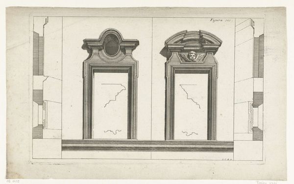 Curator: I’m struck by the precision. There’s a clinical elegance to the linework in this etching. Almost like looking at a technical drawing for a dream home. Editor: Exactly! This engraving, created by Georg Conrad Bodenehr between 1708 and 1711, titled “Twee raamkozijnen”, or “Two Window Frames,” really captures a particular moment in Baroque architectural aesthetics. Look at how he contrasts the sharp angles with the swirling ornaments. Curator: I notice the emptiness within the frames—almost a challenge. Are we meant to imagine what vistas these windows might reveal? Or perhaps contemplate the act of viewing itself? It's interesting how each one offers a unique perspective, isn't it? One’s sharp, almost severe, while the other features a sweet cherubic figure overhead. The devil and the angel, overseeing how we view the world. Editor: That tension is precisely the point! The Baroque period was wrestling with these dichotomies all the time—order and chaos, the divine and the earthly. The window, historically, isn't just a source of light, it is a very public portal onto domestic, private lives, a reflection of status, controlled visibility for some while access denied for others. And the elaborate ornamentation, while seemingly decorative, really reinforced existing social hierarchies. Curator: So the more flamboyant your window dressing, the higher you stood on the ladder. But stripping it down, as this print almost does…doesn't that expose the naked structure beneath? There’s beauty in that stark simplicity, too. It is such a relief from so much fussy detailing. Editor: The Baroque love of detail served to mask real power imbalances, economic disparity. Seeing them side-by-side, perhaps Bodenehr wants us to question these assumptions—to choose how and what we want to view, and more critically, who gets to view us? The very idea of a window implicates who it excludes, it forces us to consider access, entry and looking onto our private space. Curator: I think I would have missed that nuance if you hadn't spelled it out for me. Art changes with our own vantage point, I guess! And now I see it, so thank you. Editor: My pleasure! Windows, like art, should always give us pause.