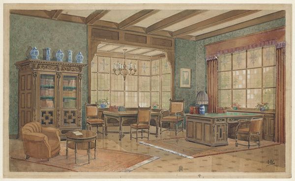 Monogrammist HK made this watercolour of a dining room with an orange service around the start of the 20th Century in the Netherlands. It offers a glimpse into the domestic life of the Dutch middle class at a time of significant social and cultural change. The composition is neat, and the eye for detail is remarkable: note the careful arrangement of furniture, the decorative objects, and the overall sense of domesticity. What does this image tell us about the social conditions that shaped artistic production in the Netherlands at this time? The interior scene reflects the values and aspirations of a society undergoing modernization and urbanization. We see an emphasis on order, comfort, and refinement, reflecting the social aspirations of the Dutch middle class. Was the artist a member of the same class as the depicted subject matter? To understand this watercolour better, we might research the decorative trends, the furniture design, and the social history of the Netherlands, all of which would give further insight into its historical context.