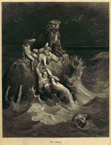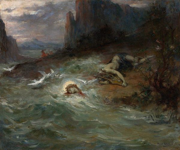 Gustave Doré created "The Oceanides" using oil on canvas, presenting a scene dominated by the interplay of flesh tones and aquatic blues. The composition centers on a craggy rock formation populated by nude figures, surrounded by a turbulent sea and an expressive sky. This arrangement evokes a sense of dramatic tension and romantic yearning. Doré manipulates light and shadow to sculpt the forms of the ocean nymphs and the rugged landscape. Notice how the whiteness of the figures contrasts with the dark, churning waters, creating a semiotic opposition between purity and chaos. The figures emerge from and blend into the sea, which destabilizes the boundary between human form and the natural environment. Doré’s formal approach reflects the Symbolist movement's interest in exploring subjective, mythological themes. The visual structure of the painting emphasizes an atmospheric perspective, conveying a sense of the sublime through the natural environment and imbuing the scene with a dreamlike quality. "The Oceanides" remains open to interpretation, inviting viewers to contemplate the relationship between humanity, nature, and the unseen forces that govern our world.