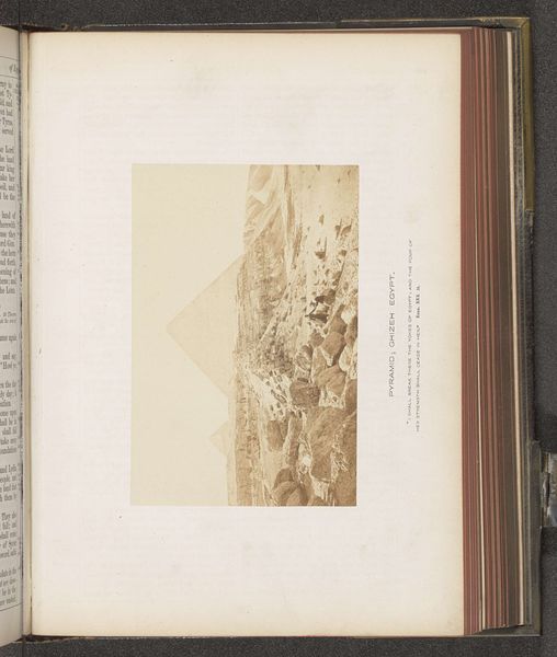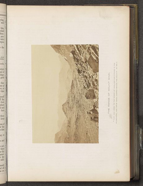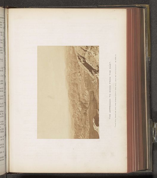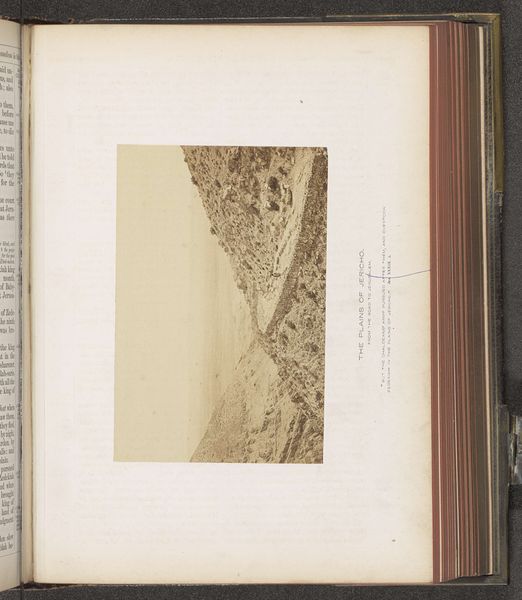 Curator: Editor: This is "Gezicht op Nazareth," a gelatin silver print by Francis Frith, dating from around 1850 to 1865, and it's held at the Rijksmuseum. It's surprisingly textured for a photograph; what details stand out to you? Curator: I observe a powerful manipulation of light and shadow. Notice how Frith uses chiaroscuro to define the topography, almost sculpting the land. The sharp contrast elongates the forms, thereby creating visual intrigue. Consider, too, the placement of the horizon line. Editor: The high horizon compresses the town below, which feels distant, yes. It creates a contrast between the vast, open sky and the somewhat cramped structures of Nazareth. Curator: Precisely. This positioning serves not merely as a documentary tool but also as an emotive one. By reducing Nazareth to a cluster of forms at the bottom, its relevance is questioned relative to the scale of the terrain and the composition. Editor: Are you suggesting it highlights the relative insignificance of human structures against the backdrop of nature and history? The image itself almost looks like an archaeological find embedded in the aged book. Curator: Precisely. This compositional strategy reflects, and subtly reinforces, thematic juxtapositions—history and the contemporary world, nature and the built environment, suggesting inherent relationships, even inherent tensions. Note also the tactile, grainy quality resulting from the printing process itself, contrasting with the almost ethereal quality of light. Editor: So it's more than just a landscape, then. The contrasting elements elevate its status. I see now it’s not *just* a place but a study of contrasting artistic tools to emphasize an intellectual claim. Thank you! Curator: Indeed. Examining such elements offers richer readings beyond representational value alone.