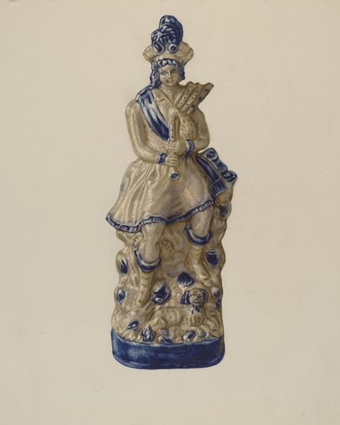 Editor: Here we have a piece entitled "Beker, ook wel Frauenbecher genoemd, in de vorm van een mannenfiguur met beweegbare armen. Kelk in de vorm van een uitstaande rok," or Cup, also called Women's Cup, in the shape of a male figure with movable arms, with the chalice in the shape of an outwardly flared skirt, created around 1600 by Jörg Ruel. It appears to be fashioned from metal and ceramic. I'm struck by the contrast between the smooth skirt and the textured bodice. What design elements stand out to you? Curator: The relationship between form and function intrigues me most. Notice how the figure's 'skirt', while representing female attire, cleverly serves as the vessel itself. Consider also the deliberate contrast in surface treatment: a shimmering golden surface for the ‘skirt’ balanced against the figure's more detailed silver rendering. These chromatic and textural differentiations contribute to a visual hierarchy. What semiotic readings could we explore through this hierarchy of value? Editor: That's fascinating! It does seem carefully planned. Do you think the movable arms serve a purely decorative function, or something else? Curator: Functionally, the articulation allows for gestural variation, modifying the object's expressiveness. More significantly, this points towards Baroque notions of dynamism. Think of the period’s emphasis on movement, tension, and drama; we see echoes of this in the figure's poised limbs. We might ask: How does this implied movement destabilize traditional ideas of static sculpture? Editor: I hadn't considered the arms contributing to a sense of motion. So, it's not just a drinking vessel but a statement about movement and dynamism through its structure. Curator: Precisely. Form, structure, movement—they all contribute to a complete, unified aesthetic. This object's significance rests in these interrelations. Editor: Thanks! It's really changed how I see this seemingly simple drinking vessel. Curator: My pleasure. This detailed look offers a valuable way to appreciating not only what something *is*, but how it communicates.