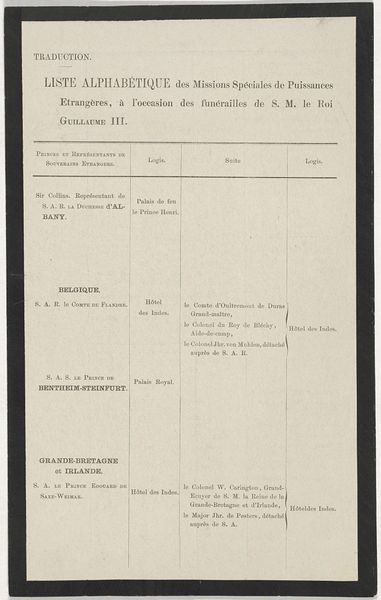 Curator: Here we have a print from between 1845 and 1846, "Bestellingslijst bij het portret van Frederik, prins der Nederlanden," housed here at the Rijksmuseum, made by W. de Grebber. It's an engraving, so we're looking at a mechanically reproduced image… what's your initial reaction to this rather functional artwork? Editor: I find it incredibly elegant, in a utilitarian way. It's like a beautiful spreadsheet from another era. The scripted typeface at the top gives it a real sense of importance, despite its humble purpose as an order form, I assume? Curator: Precisely. It's an order list for a portrait of Prince Frederick of the Netherlands, meant to be distributed in conjunction with J.P. Lange's biographical dictionary. The details matter here: it mentions the portrait will be engraved on steel, printed on "velin Jesus" paper – a specific kind of high-quality paper – and offered freely to those who order before September 15th. We're witnessing the marketing tactics of the era, the business behind art. Editor: The emphasis on materials really shines through. "Velin Jesus" paper… it almost sounds like a religious relic! Knowing that detail adds a layer of richness, highlighting the quality promised and, perhaps, a touch of aspirational luxury for the buyers. The pricing information, too, offers a tangible sense of what art was worth back then. Curator: It does! There were tiered pricing based on quality and the sheet ends up revealing a lot about the conditions of artistic production at the time. The closing date for orders, the engraver's name – W. de Grebber – it all speaks to the processes of commissioning and distribution, a web of economic relations supporting the production of art for public consumption. Editor: I agree completely. I was also struck by the formality of the typography. The careful balance between serif and script evokes the classicism of the Neoclassical period and there is something about the hand-drawn quality, even if its mechanically reproduced, it evokes trust in its readers. Curator: Yes, even the act of filling in the form becomes a part of the work's history, as customers interacted with and physically altered the object. And, beyond the single image of the prince, consider the layers of labor involved in the engraving itself, the printing, and its circulation. Editor: Thinking about how each form may have been personally delivered, the touch it evokes connects it back to both artistry and enterprise, transforming it from mere advertisement into something intimate, something personal—a document not only about value, but trust. It allows us, even centuries later, to feel like we're invited into something historic.