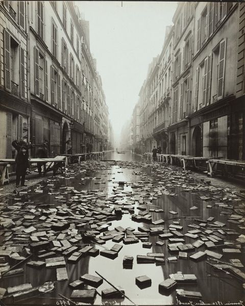 Curator: The monochrome image before us, titled "Ondergelopen straat met dammen en een kruiwagen," translating to "Flooded street with dams and a wheelbarrow," was captured by G. Dangereux between 1910 and 1911. Editor: My first thought? Somber. The grays and browns create this heavy atmosphere. The light barely pierces through, emphasizing the waterlogged street and the almost ghostly buildings. It feels… weighted by its time. Curator: The symbolism here is potent. Water often represents cleansing or chaos. But, within this urban setting, its disruption to the normal flow of life is more compelling. Note how the temporary dams barely hold it back. Editor: Those makeshift dams! And that single wheelbarrow near the bottom right – its inclusion speaks volumes about labor, about the relentless, almost Sisyphean effort to manage and contain this… deluge. The means of survival, caught in the mess. Curator: Precisely! It's not just about standing water; the flooded street transforms the familiar cityscape into a reflection of the subconscious, an almost dream-like experience with everyday objects, burdened by the flood water that turns into surreal obstacles. Editor: And think about the photographic process at the time! The effort to capture this moment, the materials involved – the glass plate negatives, the chemicals… It wasn't instantaneous. The very act of creating this image became a sort of physical act to resist ephemerality and record labor, in and of itself! Curator: Interesting to consider the idea that the architecture reflected on the water symbolizes not only how to overcome natural elements to keep urban life in constant movement but also the potential challenges that technological progress poses to people at different social levels. Editor: True, that relationship with modernity, the very real work to survive in difficult circumstances, is literally submerged here. Even the print, so subtly sepia, reflects a weariness that speaks across the decades. Curator: Indeed. Dangereux captured more than just a flooded street; he documented resilience. Editor: And reminds us how tangible struggles endure through symbolic traces and materiality.