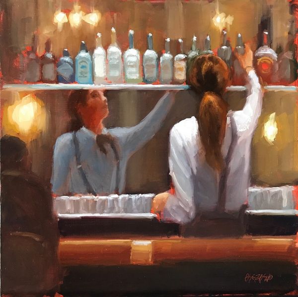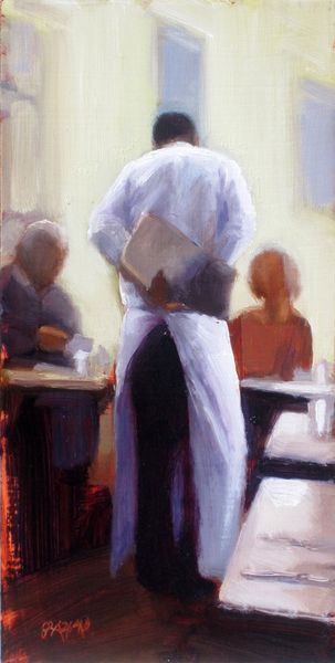 Editor: Here we have "Deux Serveurs", an oil painting with an impasto technique. The artist is Dan Graziano. The figures are loose and rendered with visible brushstrokes, which almost lends a feeling of transience to the scene. How do you read the construction of this piece? Curator: I see a study in contrasts. Notice the clear division between the light and shadow and how it sculpts the figures. This formal play contributes to the narrative. Editor: Are you suggesting that the artist uses light and shadow intentionally? Curator: Indeed. The darker tones enveloping the patrons, pushing them further back, contrast sharply with the luminescent waiters, who become central to the scene through visual prominence. Consider also the composition itself—the division of the canvas nearly in half, horizontally. Editor: What is achieved with this specific kind of compositional decision? Curator: This echoes the spatial arrangement of the setting. It is both intimate and observational. Look at how the textural richness—the impasto—contributes to this sense of immediacy. What does that materiality communicate to you? Editor: I suppose, because the textures are more immediate and less refined, it conveys a snapshot of everyday life. The brushstrokes are like a visual record of a brief, fleeting moment. Curator: Precisely. It's as if the artist captured the essence of the restaurant's atmosphere, prioritizing texture and light over rigid representational accuracy. What we take away is that a genre scene is conveyed, not just represented, on the canvas. Editor: I understand how Graziano used these techniques to show movement. Now I’m starting to think of that brushwork less as representational imperfection and more as dynamic gesture. Thank you for this closer reading. Curator: It's often within these gestures that the most compelling qualities reside, where form embodies the felt qualities of an artwork.