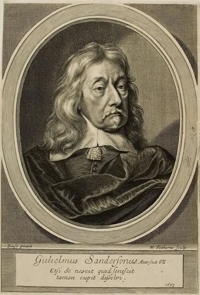 Curator: Here we have a self-portrait by Johannes van Vilsteren, dating from 1743. It's rendered in ink and engraving on paper. Editor: The first thing that strikes me is the somewhat unsettling expression. He's staring right at us, almost daring us to judge. Curator: Yes, there's a directness, wouldn’t you agree? The process of creating an engraving is laborious. Think of the planning involved, each line etched precisely, reflecting hours, potentially days, of work to represent this singular vision of himself. Editor: The symbols of his era are carefully constructed: The flowing wig, the loosely draped garment—all contribute to a deliberate presentation of status and intellect. It's as though he's curating his own image for posterity. Curator: Precisely, he’s presenting himself to a very specific consumer, one familiar with the language of Baroque portraiture and its markers of privilege. Consider the labor that would have been involved, not only from him but from the paper maker, ink producer, even the metalworkers creating the engraving tools. All facets contribute to the finished object, shaping the perception of this man centuries later. Editor: His gaze reminds me a bit of depictions of the mythological Narcissus— caught in his own reflection, but there's a vulnerability too, wouldn't you agree? The slightly parted lips almost give the sense that he's about to speak. What secrets does he want to reveal? Curator: Secrets or aspirations, perhaps? The material reality, I think, of a printed image also opens questions of accessibility. Did he make multiple impressions? Was this a means to circulate his image amongst his peers or patrons? The artwork as commodity raises fascinating questions of social distribution in that time. Editor: It really highlights how deeply entwined our self-perception is with cultural symbols of our age. His portrait makes me question the modern symbols we use for self-representation on platforms today. Curator: Yes, it does make me wonder about how artists have controlled the means of production to control an image over the passage of time. Editor: Looking at the artist’s self-representation allows an enduring way to find continuities with cultural past. Curator: I see how important it is to examine how the artwork carries meaning as an aesthetic object as well as how it becomes intertwined with the economic realities of its creation and circulation.