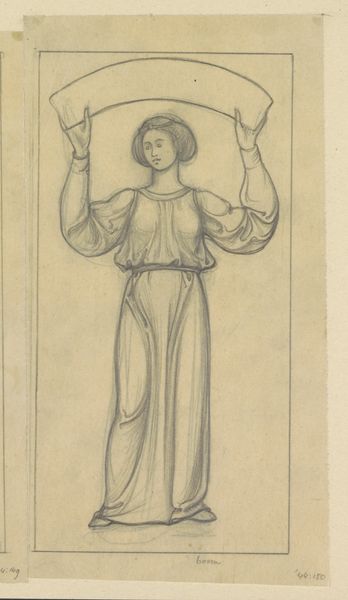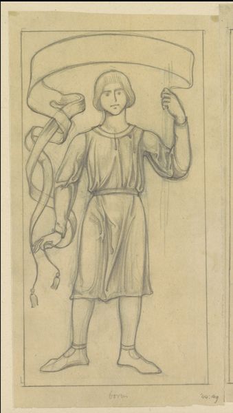 Antoon Derkinderen made this drawing, "Ontwerp voor wandschildering in de Beurs van Berlage: staande man met banderol," using graphite on paper. It's a study for a mural, depicting a standing figure holding a blank banner. The muted tones create a contemplative atmosphere. The composition emphasizes verticality, drawing our eyes upwards. Notice how the figure's simple, almost geometric form and clothing give a sense of classical dignity. The banner itself is intriguing. Its emptiness invites interpretation. The work’s formal structure echoes early Renaissance styles, characterized by clarity and order. The controlled lines and balanced shapes underscore a sense of stability and measured thought. Derkinderen’s approach uses classicism not as a rigid form, but as a structure through which new ideas might emerge. The blank banner serves not just as a design element but as a sign, waiting for content. It destabilizes fixed meanings and engages with new ways of thinking about representation.