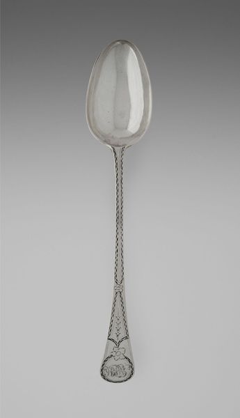 Editor: This is one of two Ragout Spoons by Paul Revere. It's made of silver, and it's quite long. It strikes me as incredibly elegant, but also functional. What do you see in this piece? Curator: I see a fascinating interplay between function, status, and the labor of crafting. Consider the silver itself – a material tied to wealth and power. Who owned this spoon, and what kind of labor practices were involved in both mining the silver and crafting the object? Editor: That's interesting. I hadn't thought about the mining aspect. Curator: And think about the term "ragout spoon." What did people eat with this spoon? Who prepared it, and what does that tell us about social hierarchies of the time? The spoon becomes a lens through which we can examine material culture and social relationships. Editor: So, it's not just a spoon, but a historical artifact of production and consumption. Curator: Precisely. Every object tells a story about its making and use. I've learned a new way of seeing Revere's work.