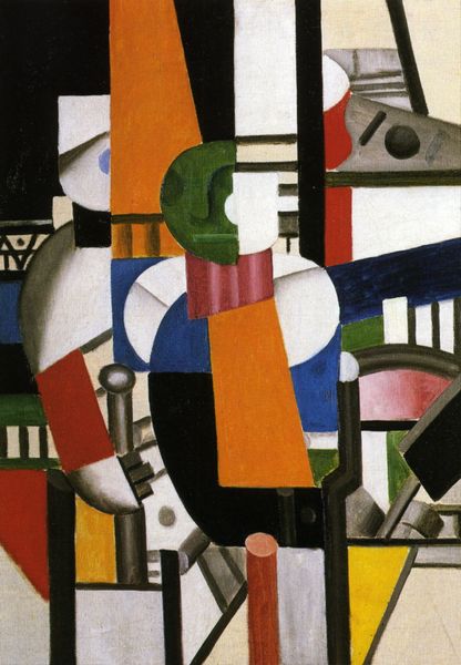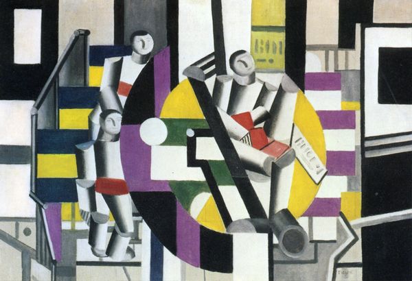 Editor: This is Fernand Léger’s "Three Figures," painted in 1921. It's a Cubist work, and it feels very mechanical and impersonal to me, even though it's supposed to depict people. What do you see in this piece? Curator: I see a reflection of post-World War I society, particularly the shift towards industrialization and the changing roles of individuals within a rapidly modernizing world. Léger was a veteran and deeply impacted by the war. His work is speaking about dehumanization and standardization. Editor: Dehumanization? I thought Cubism was mostly about breaking down perspective, visually? Curator: Absolutely, it does that. But think about what he's chosen to depict using these fragmented forms. Notice the almost interchangeable quality of the figures. What does that uniformity suggest about the individual versus the collective in this period? It seems to ask questions about the effects of technological advancement and capitalist growth on societal power dynamics. Editor: So, it’s like the figures represent cogs in a machine? Curator: Precisely! Consider too the geometric shapes and the flat planes of color, almost devoid of emotional depth. Léger deliberately stripped away individual characteristics, pointing to the growing anonymity within urban, industrialized settings. How do we define ourselves when individuality is suppressed in favour of productivity? Editor: Wow, I hadn't thought about it like that before. So it’s not just a painting of people; it's a commentary on society’s values and challenges! Curator: Exactly. Art provides social commentary on how technology shifts identity, race, gender, and politics. By exploring that relationship, the viewer understands history more clearly. Editor: I never considered how deeply connected art is to the culture of its time. This definitely provides a new framework for analysis.