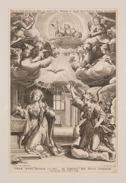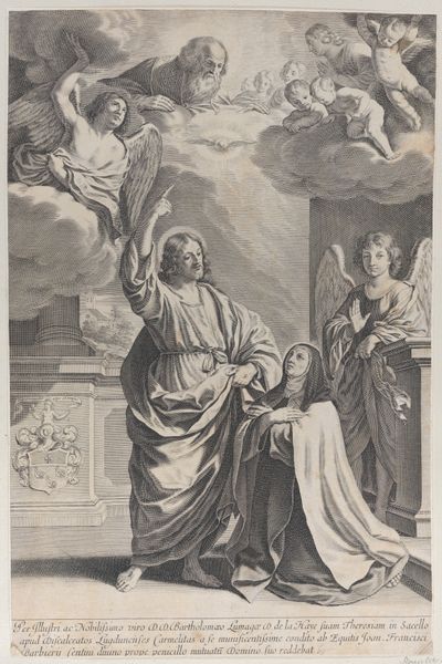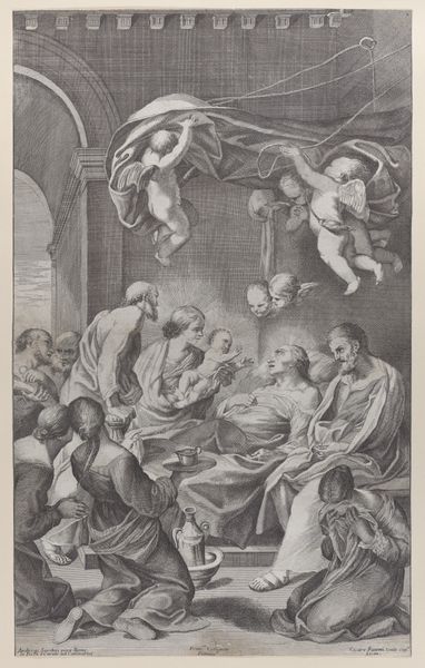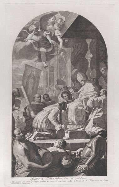 Curator: Joseph Wagner gives us “The Death of Saint Andrea Avellino in the presence of Saint Aloysius Gonzaga and Saint Stanislaus Kostka." The work probably dates between 1725 and 1780. What strikes you first? Editor: The engraving's tonal range is impressive. Wagner coaxes so much drama out of simple black and white. Death as high theater! All the billowing fabrics. It is certainly an eye-catching way of celebrating piety and mortality! Curator: Exactly. Wagner presents Avellino's death not as a stark ending, but as a moment brimming with spiritual significance, as witnessed by other saints and, dare I say, angels in attendance. Editor: Sure, I see them as observers, but who exactly made this engraving? Was it Wagner alone, toiling over the plate, or were there assistants? What were the workshop conditions like? These prints existed for mass consumption. Did the buyers consider all the labor? Curator: Ah, you ground it in the practical! It’s interesting to consider that, especially when the final image seems so ethereal. Still, look how the artist employs hatching and cross-hatching. The sheer amount of physical work suggests devotion, an offering of sorts. Don’t you think the way light filters, catching the edges of fabric and illuminating faces, brings something heavenly to it? Editor: The contrast serves the Baroque style. But even that is an act of manufacture! The stark lighting had to be conceptualized. Where did Wagner see light work this way? The lines and tonal contrasts also direct the gaze, another designed and labored act. The theatrics of martyrdom, produced by careful choices of material means! Curator: And doesn't that artifice itself, that deliberate staging, serve a greater purpose? To elevate the mundane into the divine, through artistry but also with skilled execution? We aren't seeing bare flesh here. But rich textiles meant to adorn God, and man's sacred purpose. Editor: Precisely! The image reveals how art—and religious art, at that— functions as a crafted, designed experience, relying on earthly means to depict otherworldly events, engaging materials, skill, labor. Wagner gives form to this. The rest of us just see the face value... or maybe it's the base materials after all. Curator: I see your point about artistic and commercial production, as always. Yet Wagner allows us a space to ponder what lingers when life's materials fail us. To each their perspective.