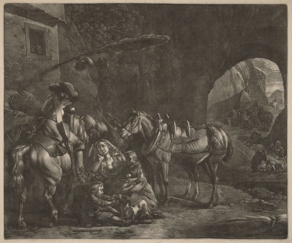 Philips Wouwerman painted “Blacksmith Shoeing a Horse” during the Dutch Golden Age, a time of immense economic and cultural growth for the Netherlands. The painting depicts an everyday scene, yet it subtly reflects the social hierarchies of the time. The blacksmith, a tradesman, is central, while the presence of horses suggests a connection to wealth and mobility. The figures on horseback contrast with those resting, perhaps hinting at the varying degrees of leisure afforded to different classes. Wouwerman often included horses in his paintings, showcasing his skill in portraying their anatomy and movement. While seemingly a simple scene, the painting hints at the complex web of social relations and economic activities that characterized Dutch society. It reminds us that even the most ordinary moments are imbued with the nuances of class and labor.