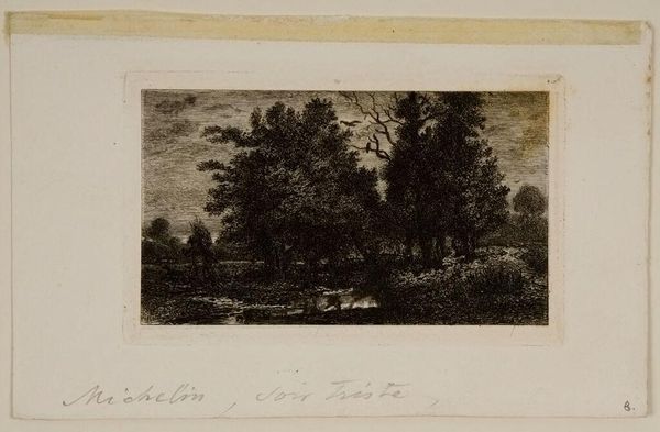 Editor: Here we have Antoine de Marcenay de Ghuy's "River Bordered on Left by Trees," an etching. It's quite small and delicate. What social structures do you see reflected in this landscape? Curator: Well, landscape art was often deeply entangled with land ownership and power. Who had the right to depict and control this scenery? How might this idyllic image mask the realities of labor and inequality at the time? Editor: That's a perspective I hadn't considered. So, it's not just a pretty picture, but potentially a statement about societal control? Curator: Precisely! Think about who benefits from this serene depiction, and whose stories might be missing. Editor: I'll definitely look at landscapes differently now. Curator: Excellent! Art invites us to question everything.