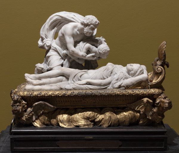 Editor: So, here we have Jan Baptist Xavery’s “Bozzetto for a Funerary Monument, Probably for Lieutenant-General Count Reinhard Vincent von Hompesch (c. 1660-1733)," created around 1728. It’s a marble relief. I find it quite striking, almost theatrical, with the figure reclining so prominently. What grabs your attention when you look at it? Curator: What immediately stands out to me is how this sculpture embodies the visual culture surrounding death and commemoration in the 18th century. These funerary monuments weren't just personal tributes; they were powerful statements of social status and political ideology. Xavery uses the conventions of Baroque sculpture, like the dramatic pose and detailed carving, to construct a particular image of Count Hompesch. Considering this, what political and social implications might this artwork carry? Editor: I hadn't thought of it as a political statement. The Count’s pose almost seems too casual for someone of such high rank, doesn't it? Curator: Perhaps, but think about how rulers and generals were depicted. Even in death, they're carefully crafting a persona. This "casual" pose might signify not weakness, but ease and inherent authority. Consider the institutions that commission artworks like these - powerful families, the Church, the state. How did those entities influence what we see? Editor: It’s fascinating to consider how much these sculptures were shaped by social and political forces of the time, making a statement even in commemoration. It goes beyond the individual. Curator: Exactly. And reflecting on that helps us understand how public perception was actively crafted and the ways in which even something like grief became a tool of power.