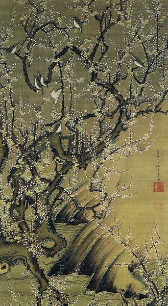 Ito Jakuchu made this painting, titled “Shuto gunjakuzu,” in the eighteenth century, using ink and color on silk. It depicts a dense flock of sparrows amid millet stalks. The material support - silk - is crucial here. Its smooth, absorbent surface allows for the layered application of pigment, creating subtle gradations of tone and texture. The artist's meticulous brushwork, coupled with the inherent qualities of the ink and colors, capture the vitality of the natural world. This process of layering and building up detail speaks to the time-consuming nature of traditional East Asian painting, where skill and patience are valued. Jakuchu’s incredible artistic rendering, with his intense attention to detail, elevates what might seem to be a humble subject, imbuing it with a sense of beauty. By focusing on the labor-intensive processes and the deep cultural significance embedded within the materials, we can better appreciate the layers of meaning in this artwork.