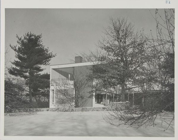Editor: This photograph by Paul Davis captures Walter Gropius's residence in Lincoln, Massachusetts, around 1938. It feels like such a stark contrast between the modern architecture and the natural landscape. What strikes you about this image? Curator: The Gropius House is incredibly significant. It represents the Bauhaus movement's arrival in America, but also reflects the complicated politics of immigration and cultural exchange during the rise of fascism. How does the image speak to the idea of "home" for Gropius and his family, displaced from Germany? Editor: That's a great question. The house seems almost alien in its setting. Maybe it reflects a struggle to integrate? Curator: Precisely. And consider how a photograph like this one functions within the larger narrative of modernism’s promotion and acceptance in the US. Did images like this ease or complicate that process? Editor: I hadn't considered the photograph as part of that promotion before! It definitely gives me a lot to think about. Curator: Indeed, these images are powerful tools in shaping public perception.