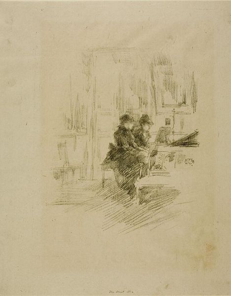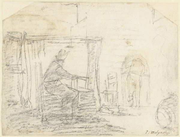 Editor: So, this is Eugène Delacroix's "Wagon Driver in the Kitchen," housed at the Harvard Art Museums. The sketch is quite small, but the composition draws me in. What do you see in the graphic qualities of this piece? Curator: Note how Delacroix employs dense hatching to define form and shadow, particularly around the figures. The contrast between these dark areas and the relative blankness of the paper creates a dynamic visual rhythm. Is there any relationship between the vanishing points and the characters? Editor: I hadn’t noticed that. Perhaps they mirror their relationships in the household? It gives me a new appreciation for the artist's technique! Curator: Indeed. Delacroix’s strategic use of line and tone guides the eye, creating a structured yet expressive depiction of a domestic scene. Editor: I see, thank you for sharing this perspective!