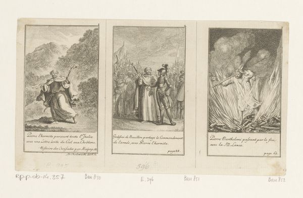 Curator: Looking at this engraving from 1789 by Daniel Nikolaus Chodowiecki, titled "Peter the Great Kisses the Condemned Woman," I’m immediately struck by its stark portrayal of power and vulnerability. Editor: Yes, that's my immediate impression too. I find myself drawn to the textures, especially the hatched lines used to depict the clothing and create tonal variations. It's interesting how the medium itself, this print, contributes to the story’s solemn feeling. The labor in creating this—the etching process, the paper it's printed on—all these materials underline the gravity of the depicted scene. Curator: Indeed. Consider the socio-political climate in which this image was made. The late 18th century witnessed a surge in interest in representing historical narratives and moral lessons. Prints like these would have circulated widely, shaping public perceptions of rulers like Peter the Great. What purpose did prints like this serve for public audiences? Editor: Well, beyond pure documentation or illustration, it looks like Chodowiecki engaged the contemporary print market by reproducing historical anecdotes as moralizing images, or a cautionary tale to promote social control. Notice the precise lines used for rendering figures versus the relatively quick crosshatching to show their garb and the other material features of the artwork. Curator: Right, and we need to consider the institutional context as well. Pieces like this were often commissioned or created for specific patrons, playing a role in the patronage system of the time. The Rijksmuseum as the owner influences how this artwork is seen today, giving it new relevance in art and social historical discourse. Editor: The distribution of such a print through various channels — from individual sales to bound collections—affected who encountered it and what social significance they gleaned from it. I wonder, what does this engraving tells us about the means of production of visual content in the late 18th century? Curator: This reminds us that art doesn't exist in a vacuum. It’s embedded in social networks, economic realities, and political agendas. It forces us to think about art's social responsibility, and the historical power that leaders exert. Editor: Precisely. Analyzing the processes involved— from artistic choices to distribution methods—allows us to connect artistic representation to social experience, while questioning the very notion of "high art." We gain deeper insight into a particular social-cultural historical juncture when examining materials used and methods applied in art production.