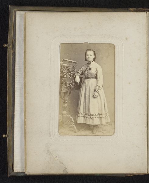 Witz et Cie. created this subdued sepia portrait of a young woman using photography. Her frontal pose and steady gaze create an immediate sense of presence. The composition is carefully arranged, balancing the figure against the furniture. The soft tonal range and sepia wash evoke a sense of nostalgia, yet the photograph's formal structure—the lines of the furniture, the framing of the figure—suggest a controlled, almost structured world. The subdued palette and the young woman’s dress evoke the period’s emphasis on restraint and decorum. The small dimensions of the photograph contribute to its intimacy, inviting close inspection. However, this apparent order is not without its subtle tensions. The figure's slightly off-center position and the way her dress merges into the background challenge any fixed reading, suggesting photography's capacity to capture the ambiguities of identity and representation. These elements engage with broader themes of representation and the human condition. This image invites us to consider the complex interplay between form and meaning, order and ambiguity.