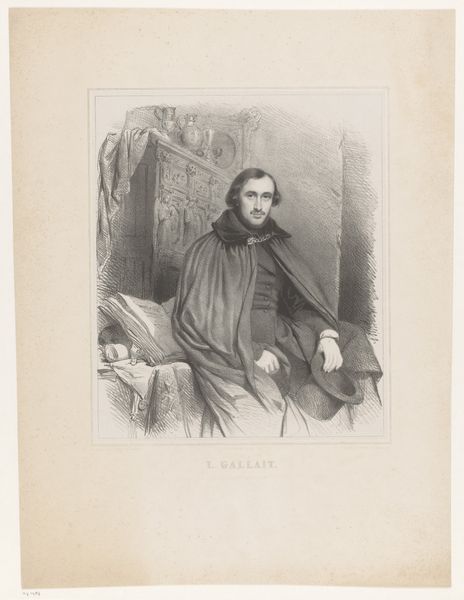 Curator: So, here we have an engraving from 1767. Antoine de Marcenay de Ghuy made this portrait of Henri de Latour d'Auvergne, the Vicomte de Turenne. Editor: My first thought? Melancholy! Even the framing—the greenery creeping around a low wall—feels a bit like mourning. The stark contrasts of light and shadow give the man such gravity. Curator: Well, remember that engravings, unlike painting, are about reproduction and accessibility. De Ghuy would have considered his audience and what sort of imagery conveyed status, power and, of course, commemorated Turenne's legacy. Editor: You’re right. But even understanding that it's a calculated representation doesn’t diminish the feeling. There's something so human about the softness in his eyes, offset against the cold steel of his armour. Did armour symbolize strength, or oppression for you? It is like holding those two things together. Curator: Indeed, there’s tension. The piece highlights the transition from the Baroque, all dramatic flair and aristocratic symbolism, to something hinting at the Enlightenment ideals of honoring great men. The text itself—"It makes honor to man”—speaks to this. Editor: And the landscape lurking in the background, that ghostly hint of nature... almost mocking the very notion of human achievement. That makes it seem very real for me, because you’ve always had a complicated relationship between humans and nature, haven't you? It makes him mortal somehow, against that grand backdrop. Curator: Exactly. These choices serve a purpose; by crafting him amidst this landscape and hinting at mortality, de Ghuy elevates Turenne's story to one beyond simple military victory. Editor: You’ve framed how material and message are intertwined in ways that amplify emotional nuance. It does make this piece much more poignant for me. Thanks! Curator: The nuances are always revealed in careful consideration of their interplay. I leave this engraving more enriched for the perspectives that were raised.